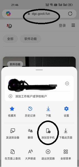 安卓手机:用Edge浏览器,打开 输入网址: dgc.gooli.fun ,右下角菜单点击 添加至手机 11天前 admin 第一步:使用手机上自带的edge浏览器,点击打开 第二步 输入网址: dgc.gooli.fun ,右下角菜单点击 添加至手机 ,如下图黑圈所示。 已赞 (0) 上一篇文章【无打扰版】 精准获取村提醒动态消息